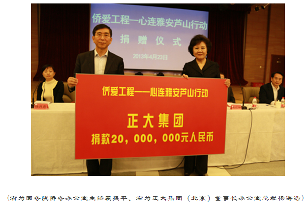 2013年4月20日8時02分,四川省雅安市蘆山縣發(fā)生7.0級地震。消息傳來,舉國震動。中國人民心連心,一方有難八方支援,全國人民與雅安人民站在一起。社會各界紛紛伸出了援助之手,對災(zāi)區(qū)進行了各種形式的捐助、支持與幫助。4月23日,正大集團為雅安地震災(zāi)區(qū)捐款人民幣2000萬元,集團(北京)董事長辦公室楊海浩總裁代表集團出席國務(wù)院僑辦舉行的“僑愛工程——心連雅安蘆山”行動捐贈儀式。