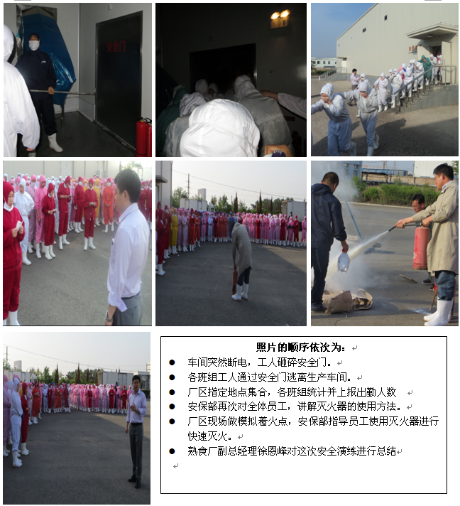 熟食二廠全體員工332人,于2013年06月16日16:40分,在熟食廠副總經(jīng)理徐恩峰、公司安保部劉龍軍的指揮下,進(jìn)行了一次以“緊急事故發(fā)生時熟悉疏散路線、提高疏散速度、減少人員傷害“為目的的模擬安全演練。